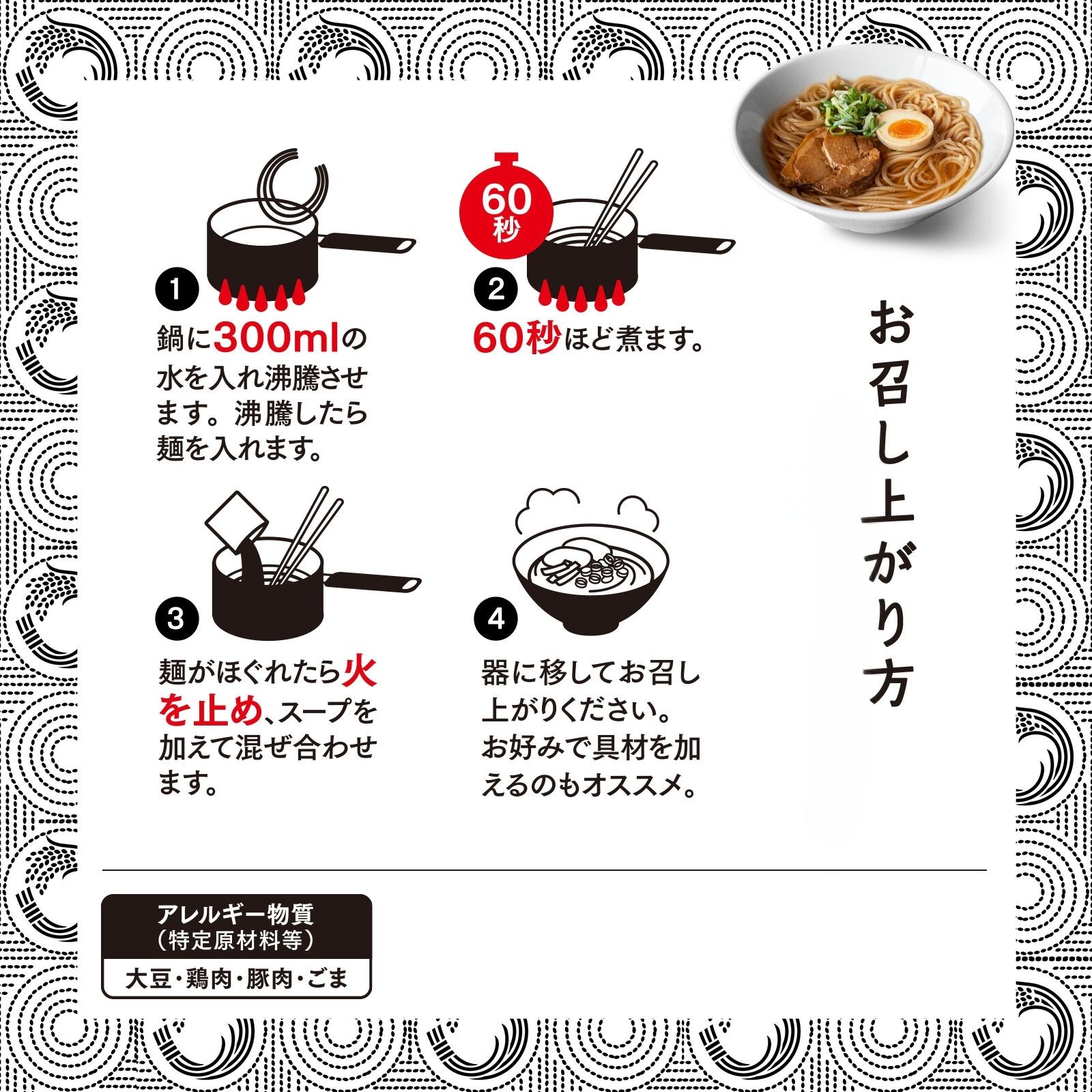 300mlのお湯と合せるだけで簡単にしょうゆラーメンスープが完成